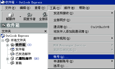 1.啟動(dòng)Outlook Express; 2.依次單擊"工具->帳號(hào)"菜單項(xiàng),打開(kāi)"Internet 帳號(hào)"窗口;