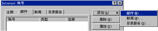 3.單擊郵件標(biāo)簽(默認(rèn)); 單擊"添加"按鈕,從彈出的菜單中選擇"郵件"選項(xiàng)將彈出Internet連接向?qū)В?