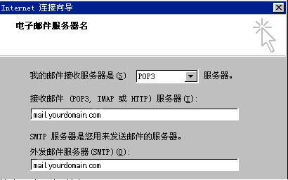 單擊"下一步"按鈕; 7.在彈出的"電子郵件服務(wù)器名"窗口中,系統(tǒng)默認(rèn)"我的接收郵件服務(wù)器"為"POP3",不需要修改; 在接收郵件(POP3,IMAP或HTTP)服務(wù)器(I)"中填寫(xiě)您接收郵件的服務(wù)器地址,例如:mail.yourdomain.com;