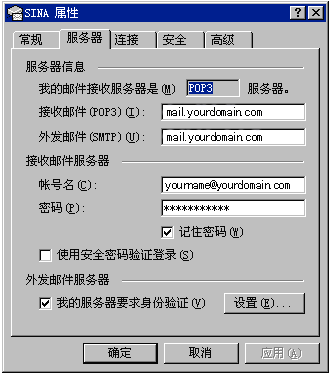 其中帳號(hào)名是您的郵箱地址,例如您的郵箱地址是yourname@yourdomain.com,則帳號(hào)名是yourname@yourdomain.com;為了確保安全,密碼顯示為星號(hào)。如果您沒(méi)有輸入密碼或輸入密碼有誤,系統(tǒng)會(huì)在接收郵件時(shí)提示您輸入密碼。