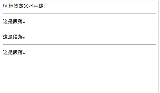 <html> <body> <p>hr 標(biāo)簽定義水平線:</p> <hr /> <p>這是段落。</p> <hr /> <p>這是段落。</p> <hr /> <p>這是段落。</p> </body> </html>